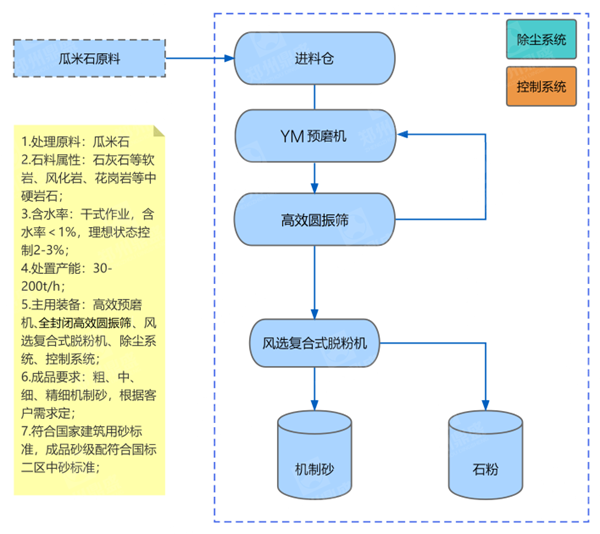 主用裝備瓜米石低制粉全篩分超細破碎機,是專門針對瓜米石等低動能、低產(chǎn)率、磨損較大的小骨料制砂,在現(xiàn)有預磨機的基礎上改良升級的新一代專用整形破碎機。設備采用立式結構,分級破碎工作方式。