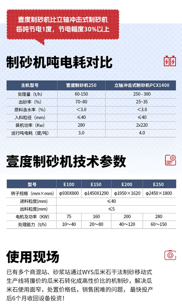 瓜米石制砂專用制砂機(jī)(壹度制砂機(jī))與市面上傳統(tǒng)的沖擊式制砂機(jī)的區(qū)別主要是成砂率、顆粒級配、含粉量以及用電量。