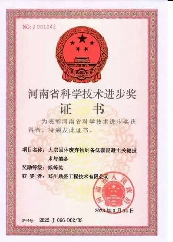 3月24日,河南省人民政府發(fā)布《關(guān)于2022年度河南省科學(xué)技術(shù)獎(jiǎng)勵(lì)的決定》。根據(jù)《河南省科學(xué)技術(shù)獎(jiǎng)勵(lì)辦法》(省政府令第57號(hào))規(guī)定,經(jīng)省政府常務(wù)會(huì)議審議,特別對(duì)2022年度河南省科學(xué)技術(shù)杰出貢獻(xiàn)獎(jiǎng)、河南省自然科學(xué)獎(jiǎng)、河南省技術(shù)發(fā)明獎(jiǎng)、河南省科學(xué)技術(shù)進(jìn)步獎(jiǎng)等進(jìn)行表彰獎(jiǎng)勵(lì)。其中由鄭州鼎盛聯(lián)合華北水利水電大學(xué)、中建七局第四建筑有限公司共同完成的“大宗固體廢棄物制備低碳混凝土關(guān)鍵技術(shù)與裝備”項(xiàng)目,喜獲河南省科學(xué)技術(shù)進(jìn)步二等獎(jiǎng),填補(bǔ)了鄭州鼎盛在該領(lǐng)域內(nèi)的空白,為公司在技術(shù)創(chuàng)新領(lǐng)域開創(chuàng)新局面。