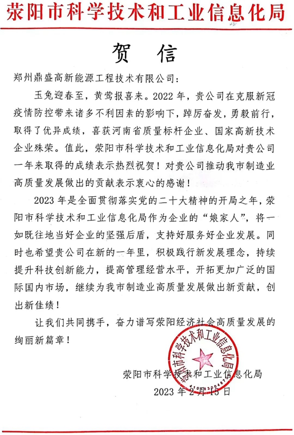 2月15日,滎陽市科學技術和工業(yè)信息化局向鄭州鼎盛高新能源工程技術有限公司(以下簡稱“鄭州鼎盛”)發(fā)來賀信。向公司過去一年取得優(yōu)異成績表示祝賀,恭賀鄭州鼎盛喜獲河南省質量標桿企業(yè)、國家高新技術企業(yè)等殊榮。對鄭州鼎盛推動滎陽市制造業(yè)高質量發(fā)展做出的貢獻表示感謝。